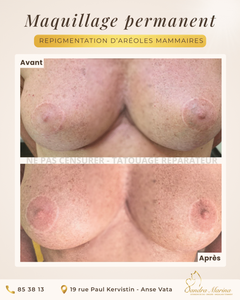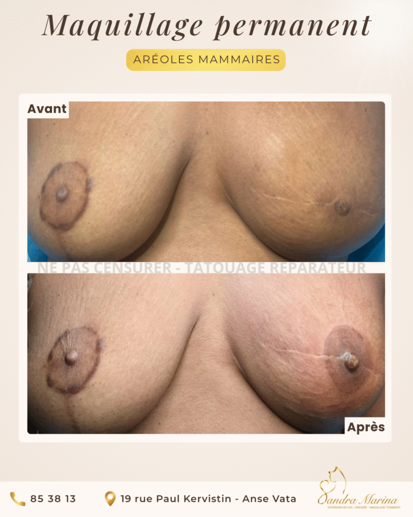 Ces exemples mettent en lumière un travail à visée réparatrice et esthétique, notamment la reconstruction de l’aréole mammaire en effet 3D, réalisé avec précision, sensibilité et respect du parcours médical.